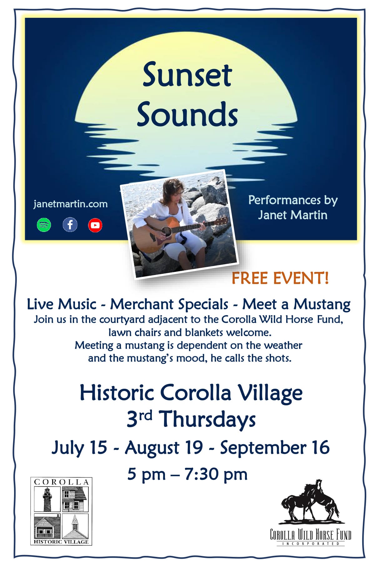 Start your evening at Sunset Sounds, a free concert, and community event in the Historic Corolla Village, on Thursday, July 15th. Enjoy live music from singer-songwriter Janet Martin from 5:00 pm to 7:30 pm in the courtyard adjacent to the Corolla Wild Horse Fund Museum. Stroll through the old, restored village to find specials and sales, the best BBQ, delicious pizza, wraps, and sandwiches — all available from local merchants. Sanctuary Vineyards will be there too! Lawn chairs and blankets welcome. Weather permitting, a rescued Corolla mustang may join us… if he’s in the mood.