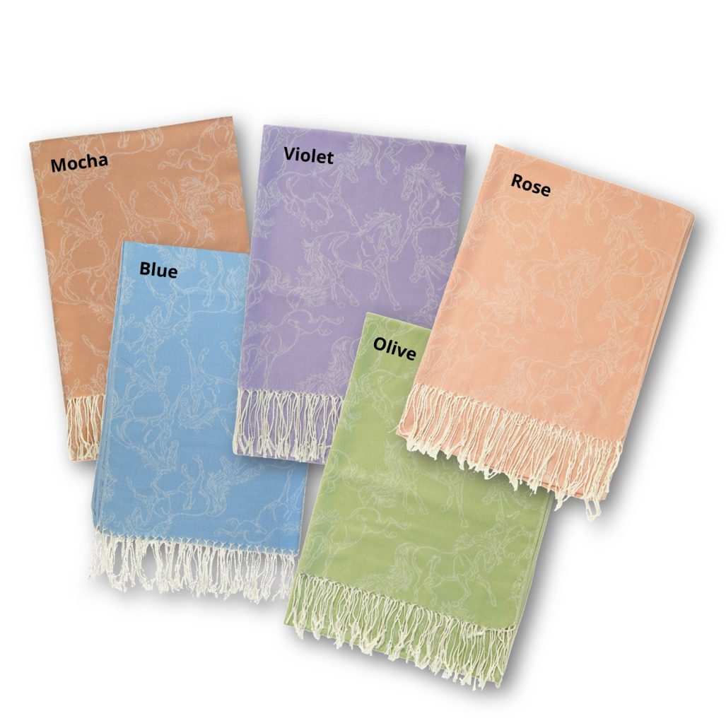 This luxurious polyester blend scarf mimics the look and feel of woven silk, offering a soft, elegant touch. Featuring a beautiful equestrian horse design by renowned artist Lila Blakeslee, it adds sophistication to any outfit. Versatile enough to wear as a scarf or shawl, it’s a perfect accessory for horse lovers. Easy to maintain with hand wash, this exclusive piece brings timeless style to your wardrobe. Exclusive design by Equestrian Artist, Lila Blakeslee. 28″ x 72″.