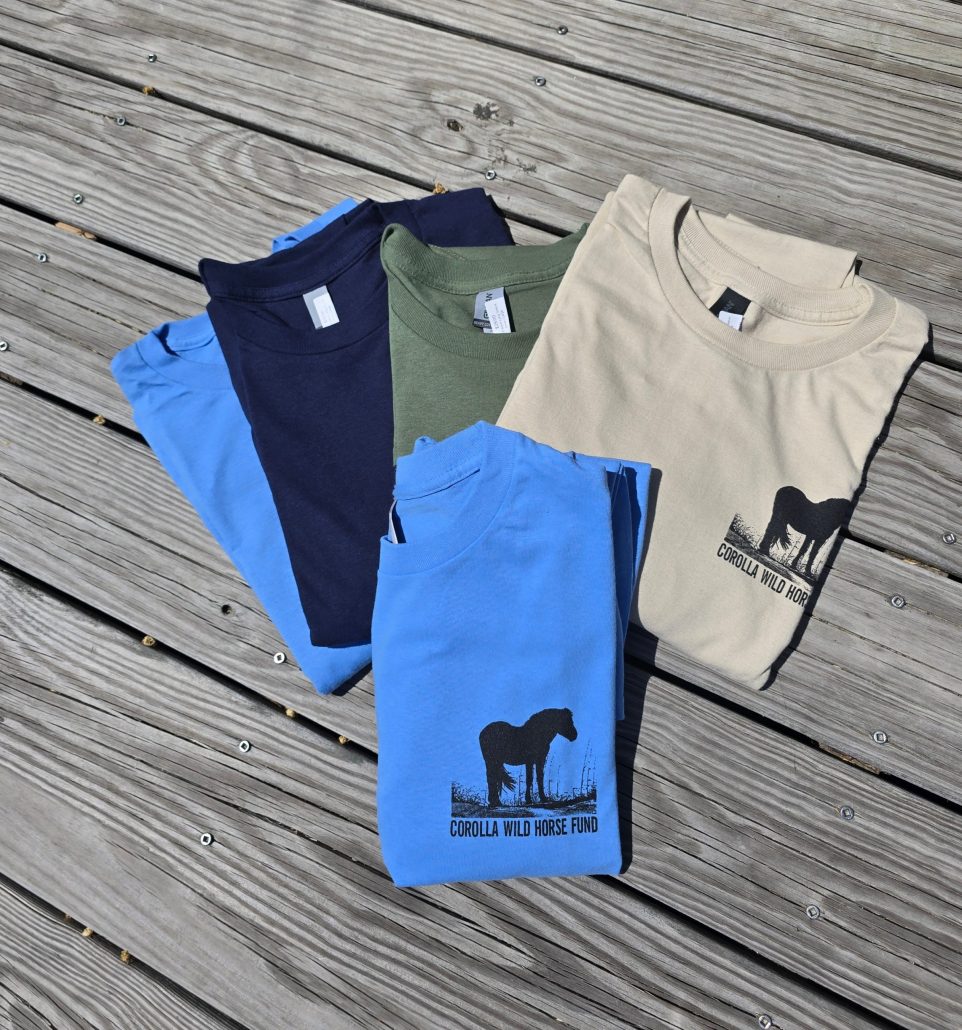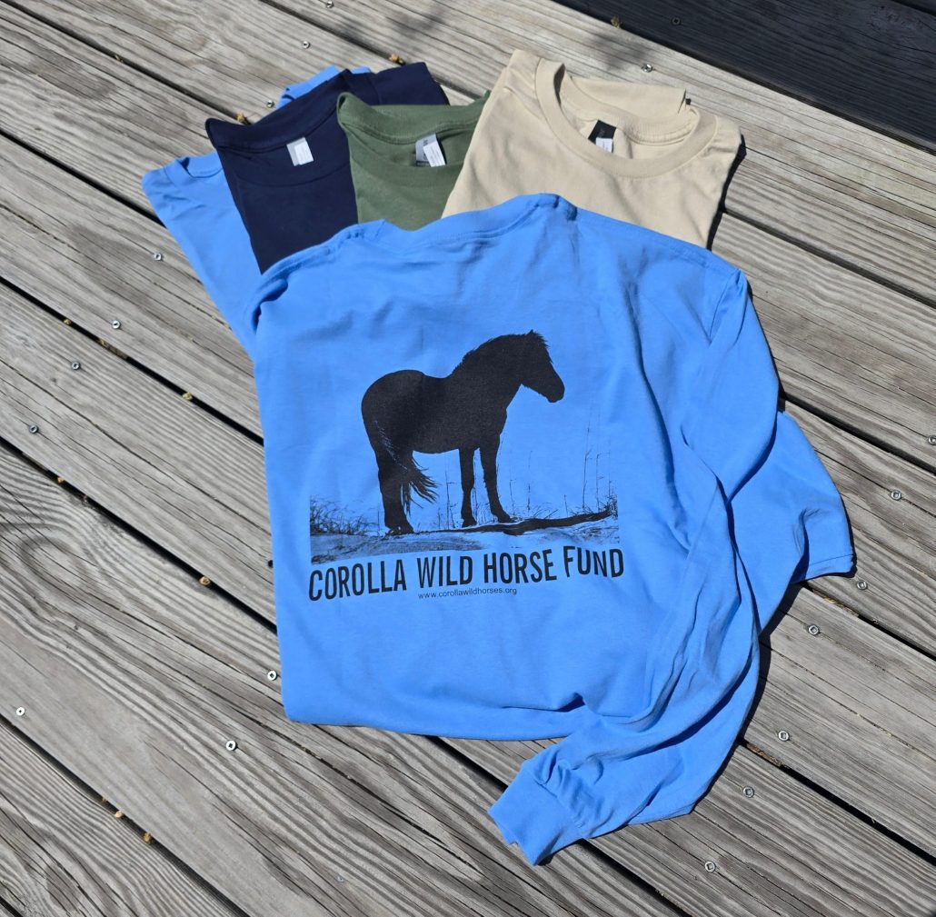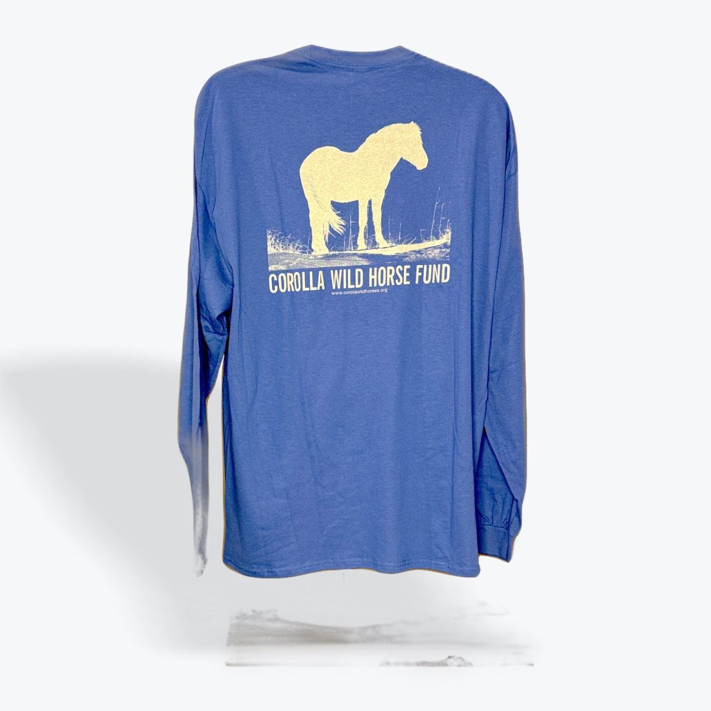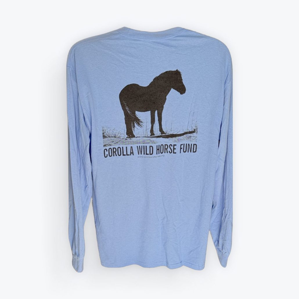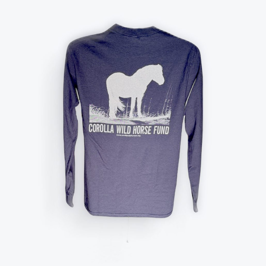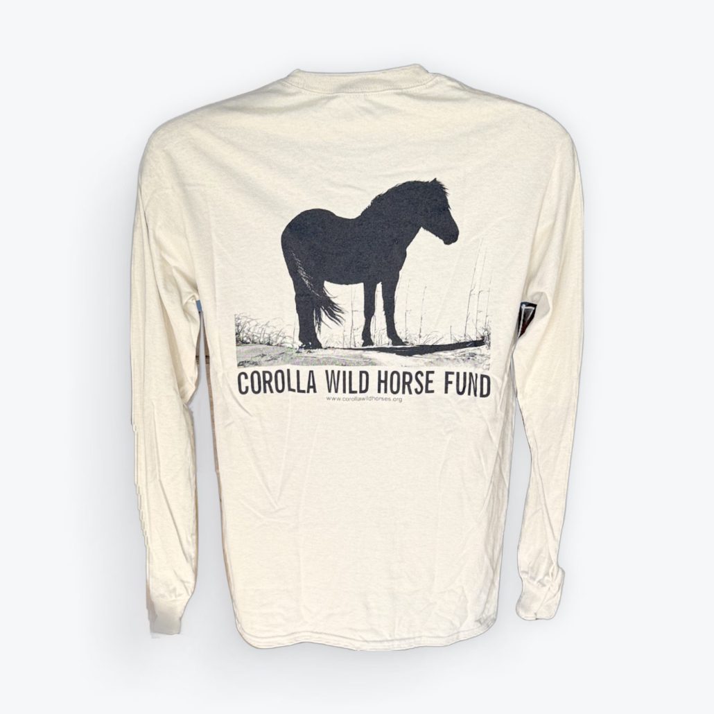 The Mustang on the Dune long-sleeved t-shirt is a beach trip reminder every time you wear it. Proudly show your support for the wild Bankers on the 4×4. Available in 4 colors—featuring two images: a small image on the front and a larger, powerful Banker on the back.